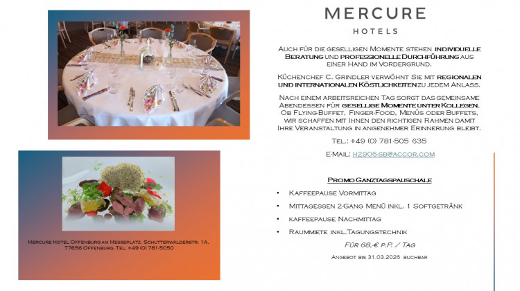 Das Mercure Hotel in Offenburg am Messeplatz ist in nur 5 Fahrminuten von der Autobahn A5 Basel-Heidelberg erreichbar. Dank der verkehrsgünstigen Lage und der Nähe zum Offenburger Zentrum, ist unser Hotel der ideale Ausgangspunkt für Touristen und Geschäftsreisende. Modernste Tagungs- und Banketträume, in Größen von 32 - 300qm, für bis zu 300 Personen, machen unser Haus zur ersten Adresse für Ihre Veranstaltung. Für Freude an gutem Essen ist ebenfalls gesorgt. Das Restaurant "Hofkammer" empfängt Sie im traditionellen, Schwarzwaldambiente und in der romantischen Weinstube "Schenke" lernen Sie badische Lebensart zu schätzen. Zum Wohlfühlen laden Sie unsere 132 klimatisierten Zimmer und Suiten ein. Nichtraucherzimmer und Parkplätze (kostenpflichtig) stehen zu Ihrer Verfügung. Eine erholsame Zeit genießen Sie im Panoramaschwimmbad mit Sauna, der Infrarotkabine oder unsererm Fitnessraum. Hotel-Extras Alle Zimmer sind klimatisiert und verfügen über Flat-Screen, Telefon sowie Wasserkocher. Direkt am Messegelände nur wenige Minuten fußläufig ins Stadtzentrum, 2km zur Auffahrt der A5 Zentrale Lage zwischen Strasbourg, Freiburg, Schwarzwald, Baden-Baden, Colmar und Europa Park Kostenfreies WLAN im kompletten Hotel und kostenfreien Internet-Terminals in der Lobby